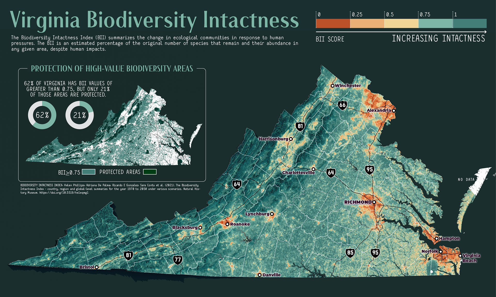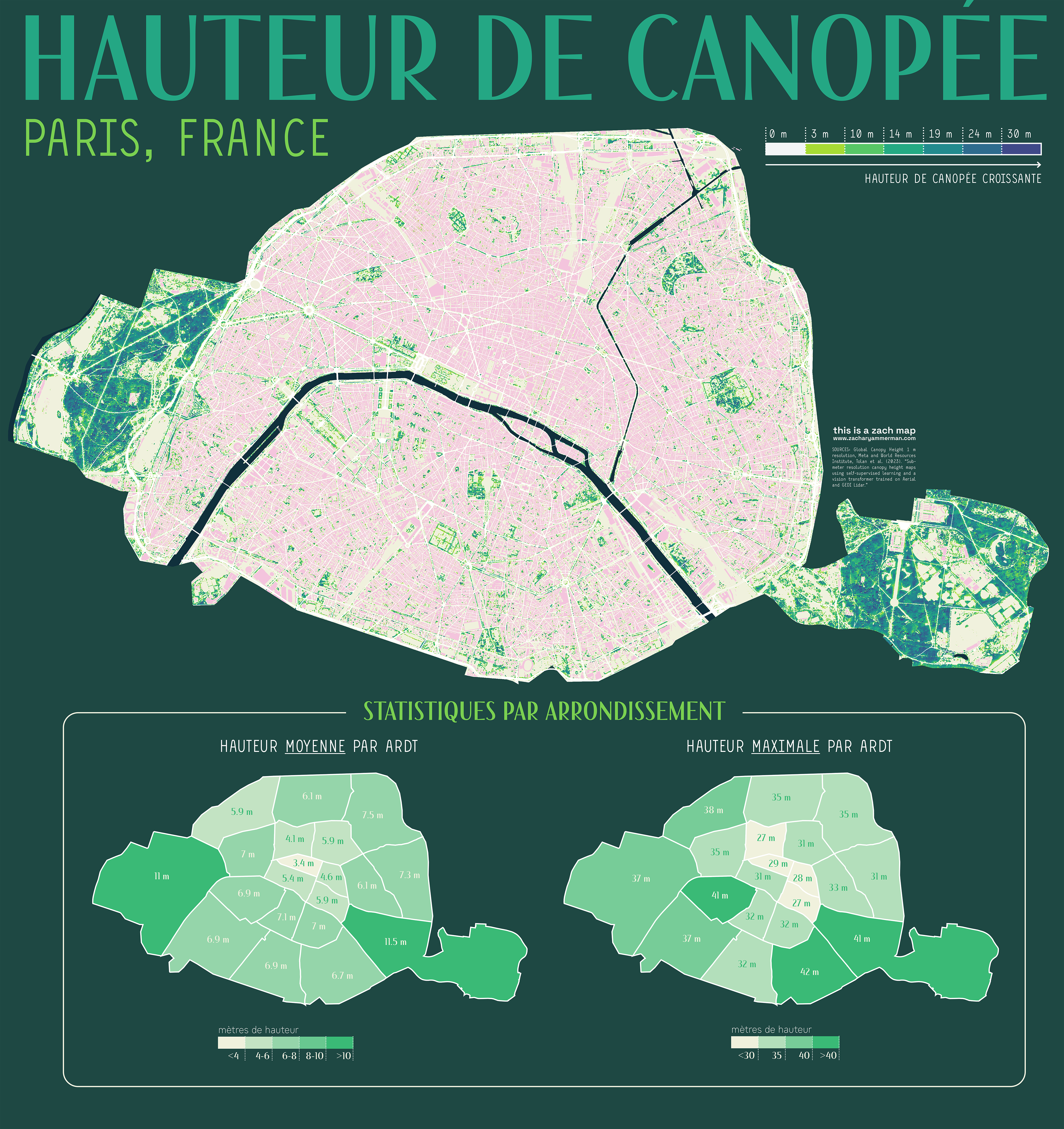 3D map of DC's land surface temperature using satellite data from July 2018, coolest temperatures in green, hottest in red. Temperatures vary from around 70 degrees F to over 116. On the hot end, you can clearly make out large avenues, highways, parking lots, rail lines and industrial zones. On the cool end, you can see almost the exact flow of rivers and the precise park boundaries of several large and small parks. Additionally, you can see the huge disparities between wealthy parts of Wards 2, 4, and 3 especially, and most of the rest of DC.